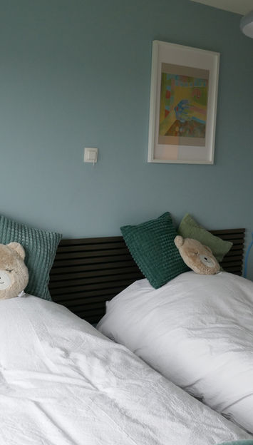 Eén kamer met dubbel bed en één kamer met twee enkele bedden die tevens samengevoegd kunnen worden op vraag. Slapen doe je volledig verduisterd dankzij de elektrische rolluiken én dat allemaal op kwaliteitsvolle boxsprings